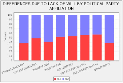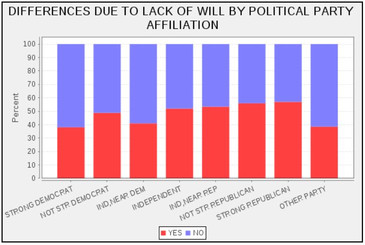 Again, the differences are small, with White Republicans slightly more likely (50% vs. 45%) to say Blacks’ economic problems are caused by lack of motivation and will power. And again, the differences are larger when the independent variable is political ideology rather than party identification.